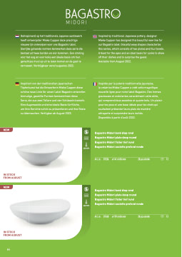 Geïnspireerd op het traditionele Japanse aardewerk heeft ontwerpster Mieke Cuppen deze prachtige nieuwe lijn ontworpen voor ons Bagastro label. Sierlijke golvende vormen kenmerken deze serie die bestaat uit twee borden en vier kommen. Een streling voor het oog en voor koks een ideale basis om hun gerechtjes mooi op uit te laten komen en de gast te verrassen. Verkrijgbaar vanaf augustus 2022.